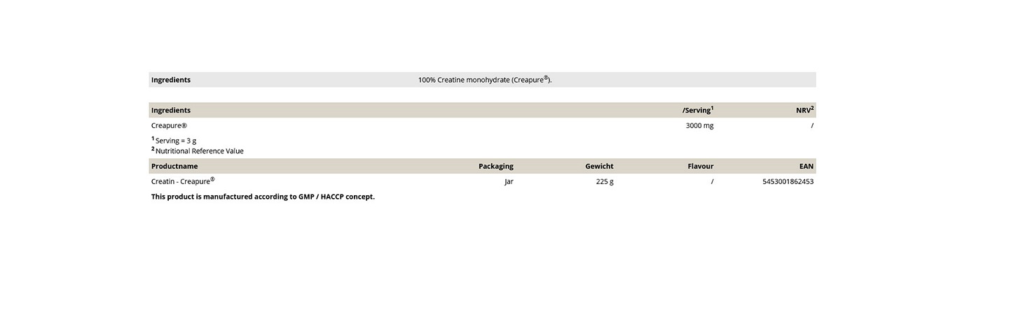 Η Creapure® κατασκευάζεται στη Γερμανία σύμφωνα με τις οδηγίες παραγωγής της φαρμακευτικής βιομηχανίας και της βιομηχανίας τροφίμων και επομένως υπόκειται στους αυστηρότερους ποιοτικούς ελέγχους. Αυτό έχει ως αποτέλεσμα ένα προϊόν υψηλής ποιότητας με σταθερά υψηλό βαθμό καθαρότητας.
